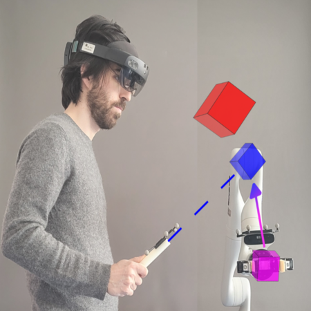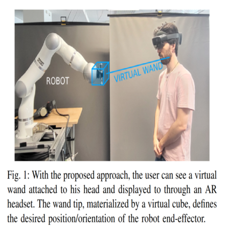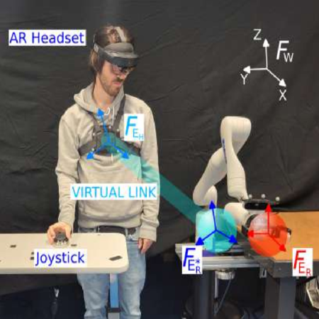 abstract = {This paper introduces an innovative control approach for teleoperating a robot in close proximity to a human operator, which could be useful to control robots embedded on wheelchairs. The method entails establishing a virtual connection between a specific body part and the robot\'s end-effector, visually displayed through an Augmented Reality (AR) headset. This linkage enables the transformation of body rotations into amplified effector translations, extending the robot\'s workspace beyond the capabilities of direct one-to-one mapping. Moreover, the linkage can be reconfigured using a joystick, resulting in a hybrid position/velocity control mode using the body/joystick motions respectively. After providing a comprehensive overview of the control methodology, we present the results of an experimental cam-paign designed to elucidate the advantages and drawbacks of our approach compared to the conventional joystick-based tele-operation method. The body-link control demonstrates slightly faster task completion and is naturally preferred over joystick velocity control, albeit being more physically demanding for tasks with a large range. The hybrid mode, where participants could simultaneously utilize both modes, emerges as a compro-mise, combining the intuitiveness of the body mode with the extensive task range of the velocity mode. Finally, we provide preliminary observations on potential assistive applications using head motions, especially for operators with limited range of motion in their bodies.},